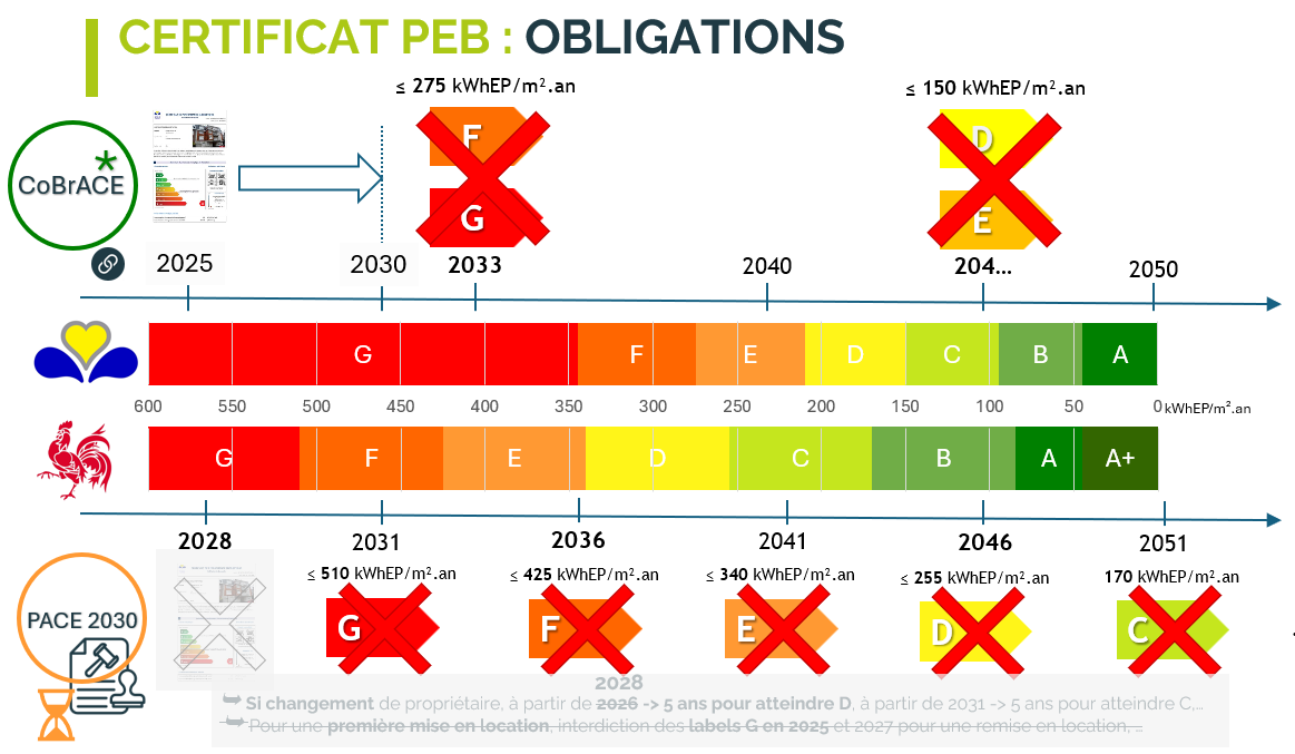 - Les certificats PEB sont obligatoires uniquement en cas de vente ou de location d'un bien. Ils intègrent des conseils de rénovation pour atteindre les objectifs.